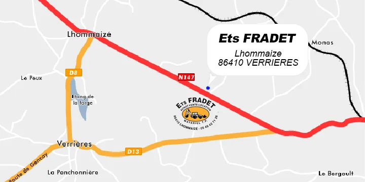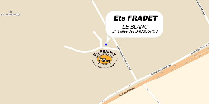 Situés sur l’axe Poitiers-Limoges, à moins de 30 kilomètres de Poitiers dans le village de Lhommaizé, et aussi à Niort, à Bordeaux, sur Poitou Charentes, les établissements Fradet sont très faciles d’accès. L’entreprise dispose d’un parc de plus de 3 hectares où la majeure partie du matériel disponible à la vente et à la location y est exposée : pelles, mini-pelles, tractopelles, nacelles,chargeuses, élévateurs, compacteurs, dumpers, remorques.. Composée d’une équipe de 9 professionnels du milieu T.P et avec une ancienneté de plus de 50 ans dans le milieu des travaux publics, l’entreprise Fradet peut vous conseiller mieux que quiconque dans l’acquisition de tous vos engins de chantier.